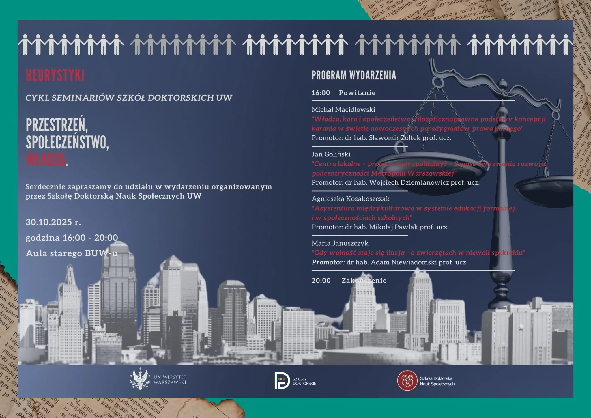 Szkoła Doktorska Nauk Humanistycznych Uniwersytetu Warszawskiego zaprasza na społeczną edycję seminarium Heurystyki pt. Przestrzeń, Społeczeństwo, Władza. Heurystyki to cykl zainicjowany przez Jego Magnificencję Rektora Uniwersytetu Warszawskiego, prof. Alojzego Z. Nowaka.